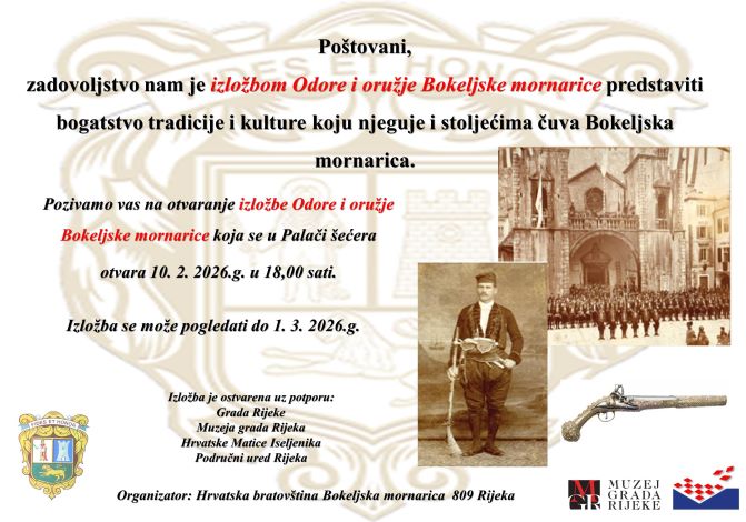 Izložba se organizira suradnjom Muzeja grada Rijeke, Hrvatske bratovštine Bokeljska mornarica 809 Rijeka i Matice iseljenika, Ispostava Rijeka. Otvara se u Palači šećera, 10. veljače, s početkom u 18 sati.</p>