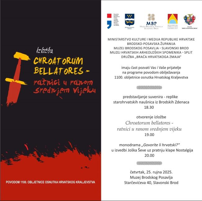 U Muzeju Brodskog Posavlja u četvrtak 25. rujna 2025. godine od 18:30 sati, započet će program povodom obilježavanja 1100. obljetnice osnutka Hrvatskog Kraljevstva.</p>