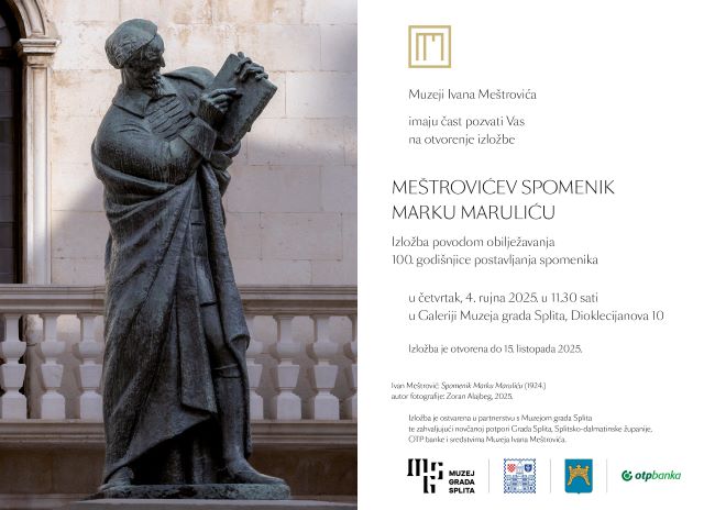 Povodom obilježavanja 100. godišnjice postavljanja <i>Spomenika Marku Maruliću</i> Muzeji Ivana Meštrovića priredili su izložbu pod nazivom „Meštrovićev <i>Spomenik Marku Maruliću</i>“ koja će u četvrtak, 4. rujna u 11.30 sati biti otvorena u Galeriji Muzeja grada Splita.</p>