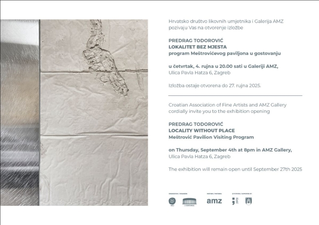 U četvrtak, 4. rujna 2025., s početkom u 20 sati, u Galeriji AMZ (Pavla Hatza 6), održat će se otvorenje samostalne izložbe Predraga Todorovića – „Lokalitet bez mjesta“. Izložba u organizaciji Hrvatskih likovnih umjetnika dio je programa Meštrovićev paviljon u gostovanju i ostaje otvorena do 27. rujna 2027. godine.<br />